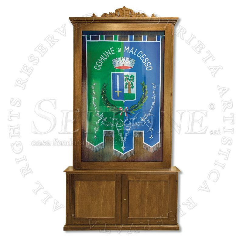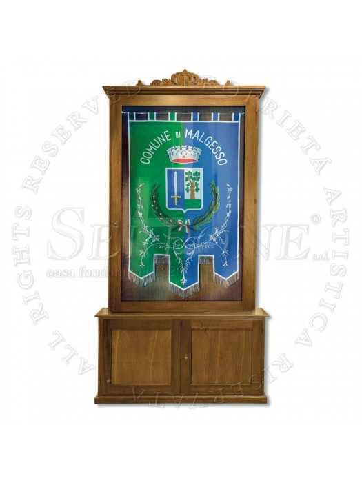 ARMADIO A BACHECA PER GONFALONI Armadio cm. 140 x 235/260, ideale per conservare ed esporre al meglio il Vs. gonfalone o labaro, con vetrina superiore e con uno scomparto per conservare gli accessori nella parte inferiore, eseguita in legno nelle tonalità noce chiaro o scuro e con la possibilità di montare alla testa una cimasa in legno intagliato a mano.Nei modelli: Tipo A - Senza cimasa Tipo B - Con cimasa Art. 221 - cm. 140 x 235/260