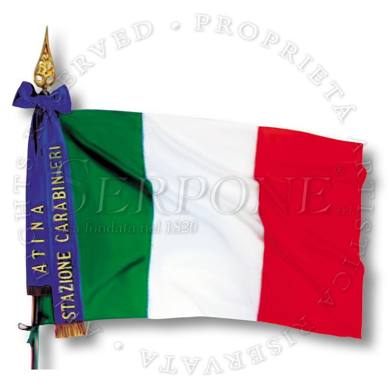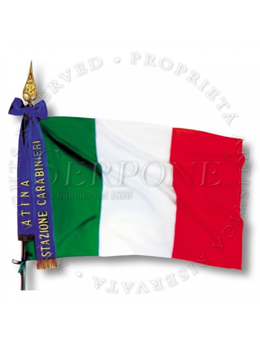 Bandiera di Presidio per comandi e caserme. Bandiera per edifici del Ministero della Difesa, Comandi, Caserme, Stabilimenti Militari, Stazioni dei Carabinieri, della Guardia di Finanza e di altre armi. Tricolore nazionale in stamina Perlon-lana confezionata con doppie cuciture, rinforzi agli angoli, guaina e corda all'inferitura. Cod. 125 - In perlon lana. - Asta non inclusa