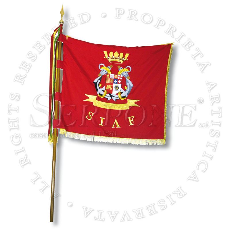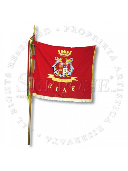 BANDIERE PER CORPI SPECIALI Bandiere in faglia cordonata pesante con stemmi e lettere ricamate a doppia faccia, a unico o doppio telo contrapposto, confezionate con frange all’orlo (in foto la bandiera a doppio telo realizzata in occasione della parata del 2 giugno per la Forza Anfibia Italo-Spagnola). Art. 316 - Bandiere in faglia cordonata pesante con stemmi e lettere ricamate a doppia faccia