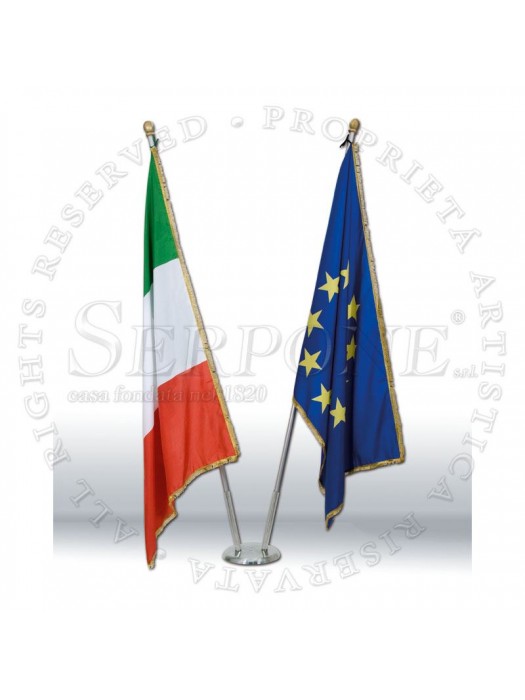 COMPLETI STAMPATI PER UFFICIO COMPLETO ITALIA -EUROPA PER INTERNO stampato, composto da due bandiere, dell’Italia e dell’Unione Europea, cm 100 x 150 in tessuto setificato stampato confezionate con frangia oro all’orlo, una base a 2 innesti, in metallo cromato e due aste. IL SET Tipo A Set con aste ad un pezzo, in alluminio anodizzato, da cm 200 e pomo dorato a vernice IL SET Tipo B Set con aste ad un pezzo, in alluminio anodizzato, da cm 200 con lancette in metallo dorato. IL SET Tipo C Set con aste in ottone lucidato, un sol pezzo, con pomo tornito e lancetta dorata. Art. 218 - varie misure disponibili