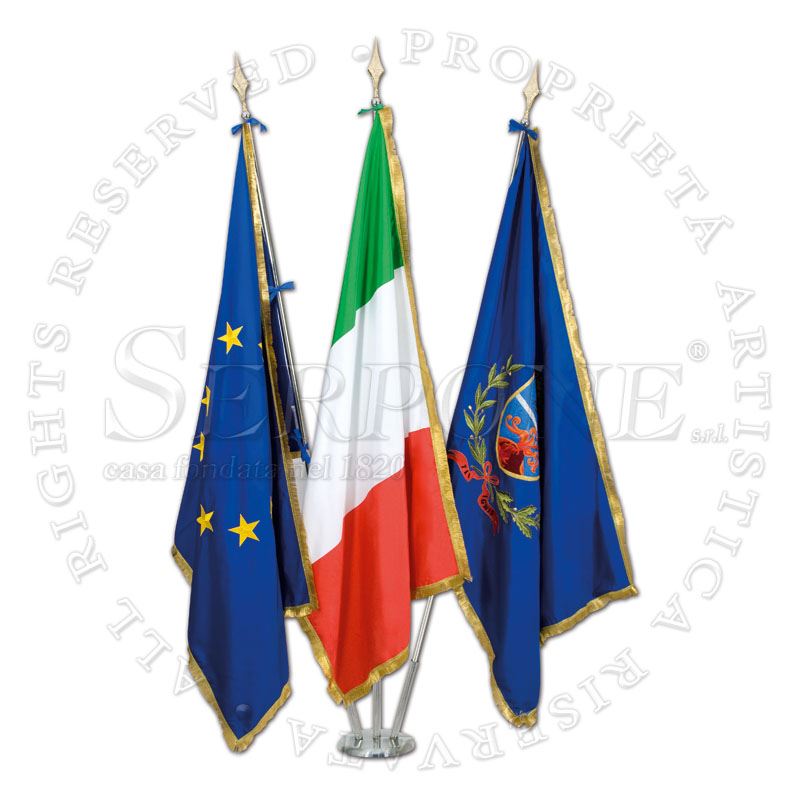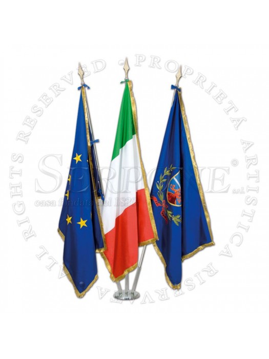 COMPLETO A TRE BANDIERE PER INTERNO, RICAMATE COMPLETO A TRE BANDIERE PER INTERNO, RICAMATE, con bandiere in faglia bemberg, di grande eleganza, Unione Europea con stelle ricamate in oro a doppia faccia, e aste in ottone nichelato da cm 200 con pomo tornito e lancia dorata. -Tipo A Con terza bandiera semplice (solo colori di fondo, senza stemma). -Tipo B Con terza bandiera di una Regione Italiana. -Tipo C Con terza bandiera con stemma ricamato Art. 258 - vari modelli