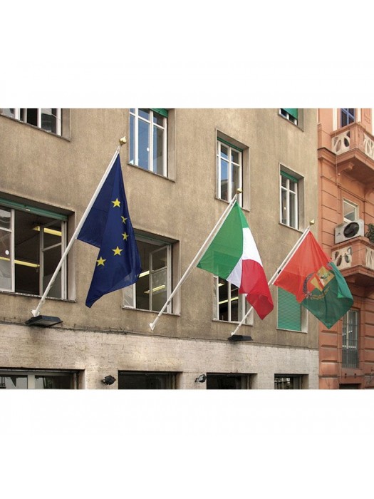 Set Italia Europa + Comune o personalizzata piccolo con aste da parete lunghe mt. 2 Set composto da: - 3 bandiere: Italia; Europa e una del Comune o personalizzata (con stemmi, loghi, scritte, etc.), in tessuto poliestere nautico da 115 gr/mq., misura cm 100x150, confezionate con doppie cuciture, guaina e corda - 3 aste coniche lunghe mt. 2, in vetroresina ad alta resistenza, colore bianco, complete di supporto da fissare al muro o balcone, pomo, corda e galloccia. Set 3 bandiere Italia Europa + Comune o personalizzata 100x150 con 3 aste da parete in vetroresina bianche lunghe mt. 2