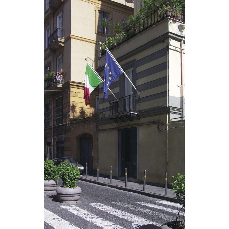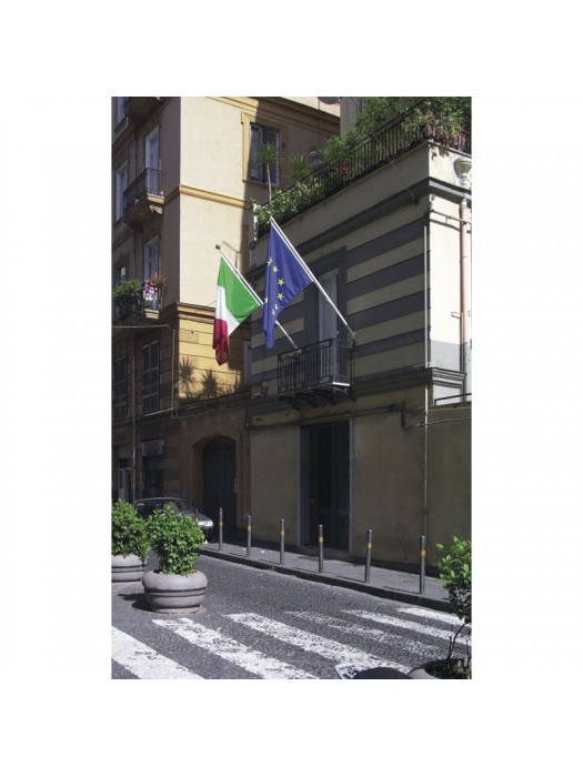 Set Italia Europa grande con aste da parete lunghe mt. 4 Set composto da: - 2 bandiere, Italia ed Europa, in tessuto poliestere nautico da 115 gr/mq., misura cm 200x300,  confezionate con doppie cuciture, guaina e corda - 2 aste coniche alte mt. 4, in vetroresina ad alta resistenza, colore bianco, complete di supporto da fissare al muro o balacone, pomo, corda e galloccia. Set 2 bandiere Italia Europa 200x300 con 2 aste da parete in vetroresina bianche lunghe mt. 4