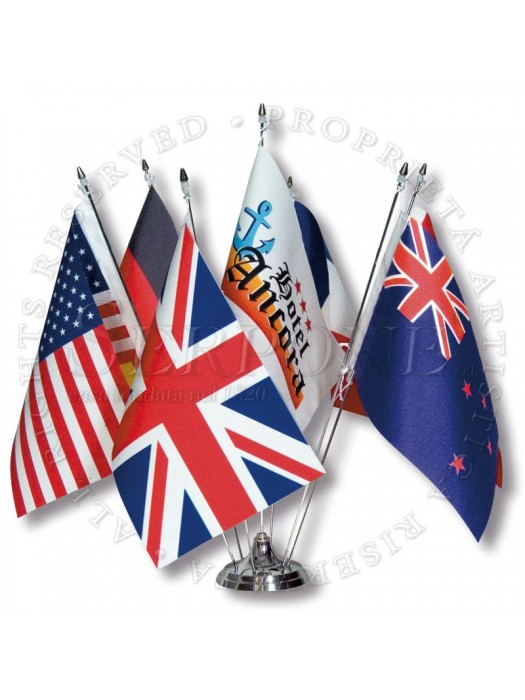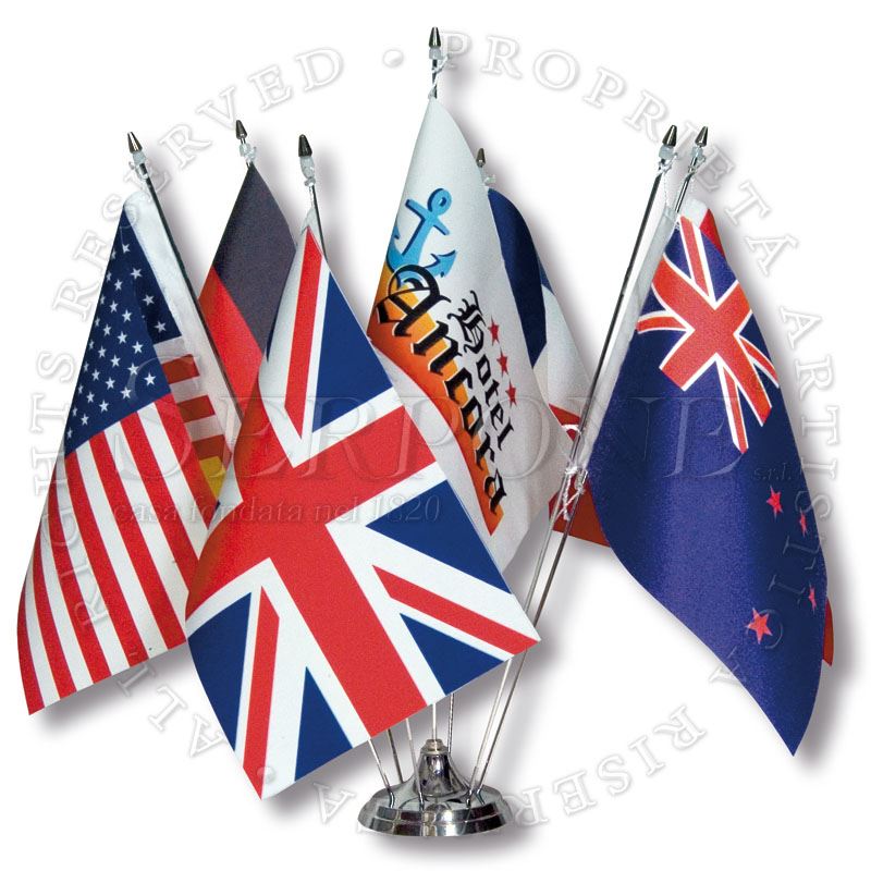 BANDIERINE DA TAVOLO Bandierine varie nazioni, in tessuto, confezionate con laccetto bianco, adatte ad ornare mense, bureau d’albergo, scrivanie etc. -Standard Piccole, misura cm 14 x 21, Grandi, misura cm 16 x 24 -In stoffa morbida Grandi, misura cm 16 x 24 Art. 136 - vari modelli