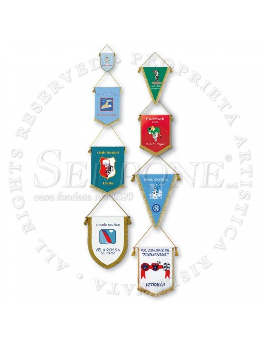Labaretti in raso stampato a regola d'arte in serigrafia Labaretti in raso stampato a regola d’arte in serigrafia (no digitale), ottima rifinitura, con galloncino e frangia, traversina con pomi in ottone, laccio giallo oro cm 28 x 36, Triangolare, cordellina con fiocchi rayon, frangia rayon anellata all’orlo, busta in cristal, minimo 100 pezzi. Art. 170/r - cm 28 x 36