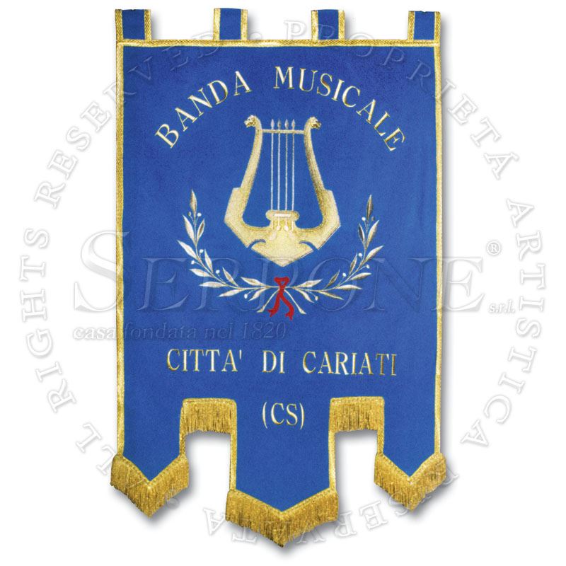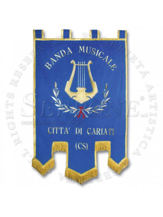 LABARI per Vigili Urbani, Bande musicali E Associazioni LABARI per Vigili Urbani, Bande musicali E Associazioni Eseguiti in faglia cordonata bemberg, di forma rettangolare, con ricamo oro, argento e seta a colore, 25 lettere ricamate in oro. Asta, lancia e traversina in metallo. Tipo A Ricamato a macchina semplice (ricamo raso) senza sfumature, con filati metallizza e sete colorate in filo. Tipo B Ricamato a macchina ad imitazione del ricamo a mano, sfumature ed effetti di ricamo vari, con filati metallizzai e sete colorate in filo. Tipo C Con ricamo imitazione ricamo a mano con parti in rilievo, lettere a rilievo in oro inalterabile. Nelle misure: - cm. 70 x 100 - cm. 80 x 110 Art. 226 - misure cm. 70 x 100 o cm. 80 x 110