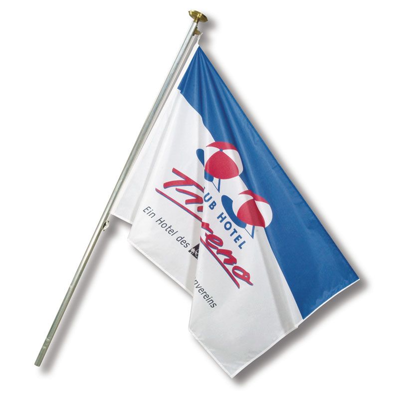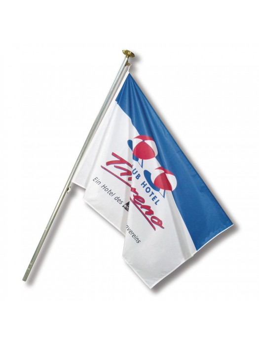 Bandiere Sociali Personalizzate Orizzontali Bandiere orizzontali con colori sociali e stemmi degli alberghi, industrie, concessionarie, centri commerciali, circoli etc.  In stamina poliestere nautica, 115 gr/m2, confezionate con doppie cuciture, guaina e corda all’inferitura. Nota Bene: Il cliente dovrà mandare la grafica della bandiera in un file vettoriale in formato .ai (Adobe® Illustrator®) oppure pagare un contributo impianto una tantum. Bandiere Sociali Personalizzate Orizzontali per esterno in poliestere nautico