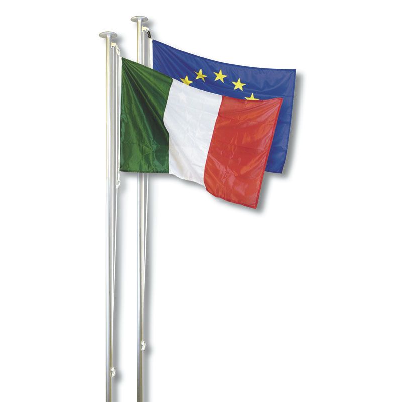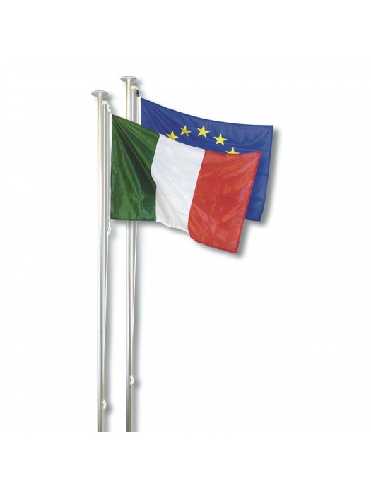 Completo "Alzabandiera" Composto da: - Una bandiera Italia in stamina nautica, confezionata con doppie cuciture, guaina e gancetti. - Una bandiera Europa Unita in stamina nautica, confezionata con doppie cuciture, guaina e gancetti. - Due aste in alluminio anticorodal spessore mm. 5, Ø mm. 40, alte mt 5 divisibili in due pezzi per facilitarne la spedizione, complete di puntale a formagetta, carrucola in ottone tornito, galloccia e corda. Completo a 2 bandiere per esterno "Alzabandiera" per issare le bandiere al mattino ed ammainarle la sera.