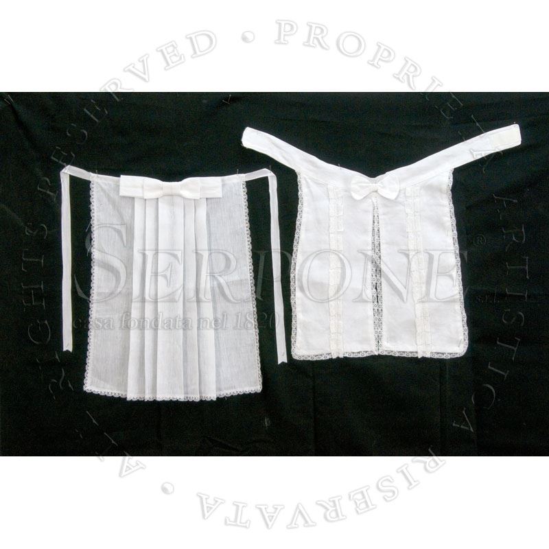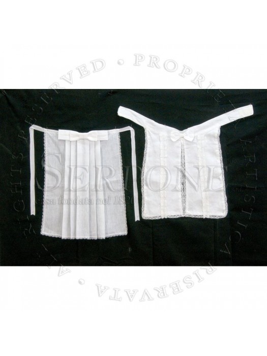 PETTINE (collari)Pettine in tessuto bianco leggero. - Con pieghe e merletto in terital-cotone, disponibile in misto lino o in lino puro;  - A due falde in lino con merletto;  - Tipo Jabot (non in foto). Art. 159 - vari modelli