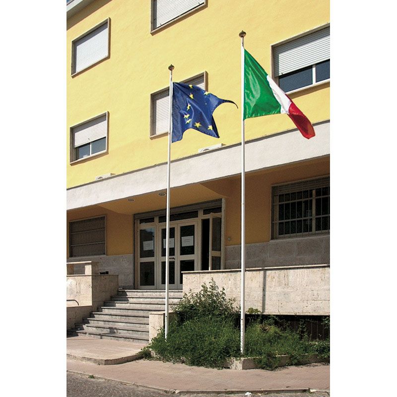 Set Italia Europa + Comune o personalizzata grande con pennoni alti mt. 6 Set composto da: -3 bandiere: Italia; Europa e una del Comune o Sociale (con stemmi, loghi, scritte, etc.), in tessuto poliestere nautico da 115 gr/mq., misura cm 150x225, confezionate con doppie cuciture, guaina e corda -3 pennoni cilindrici da mt. 6, in alluminio lega 6063 T6, colore bianco, a drizza esterna, completi di pomo, corda, galloccia, base per ancoraggio al suolo, forniti in due pezzi innestabili; installazione e montaggio estremamente semplici, accompagnati da istruzioni. Set 3 bandiere Italia Europa + Comune o personalizzata 200x300 con 3 pennoni bianchi cilindrici alti mt. 6