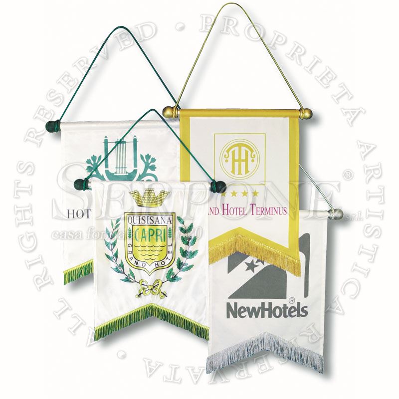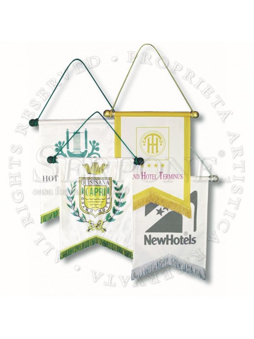 STENDARDINI Stendardini cm 45 x 60 in crepe poliestere o tessuto polilux (lucido), con stampa a colori su un lato, completi di traversina in alluminio, pomi in legno e frangia in tinta, laccio.  Art. 380 - cm 45 x 60