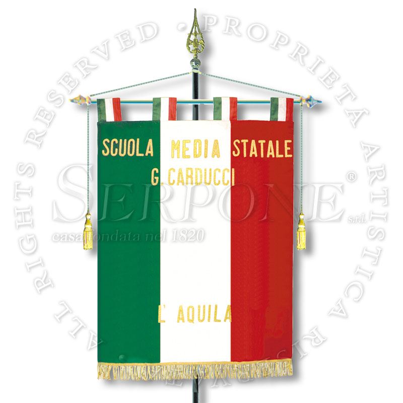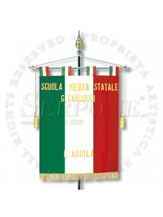 LABARO TRICOLORE Labaro tricolore in faglia bemberg, misura cm 60 x 75, con 25 lettere ricamate a rilievo in oro inalterabile, frangia in filato oro sul bordo inferiore, fodera tricolore (altra tinta su richiesta), asta in due pezzi, traversina e pomi nichelati, cordone con fiocchi in filato dorato. Se in seta pura per ogni lettera in più. € 4.00 Art. 164 - misura cm 60 x 75
