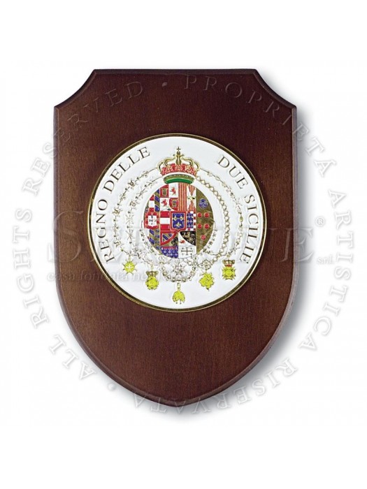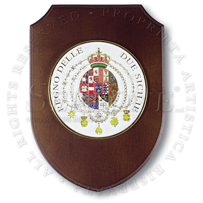 CREST DEL REGNO DELLE DUE SICILIE Scudo in legno, misura cm 16 x 21, con placca in metallo, Ø cm 11, raffigurante lo stemma del Regno delle Due Sicilie a rilievo e con smalti a fuoco Art. 459 - misura cm 16 x 21
